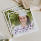 Núcleos modernos de festa de formatura com uma fotografia personalizada com uma sobreposição de texto. Substitua facilmente a imagem de exemplo por uma foto do seu formando. A palavra "Formando" aparece em roxo manuscrito, com o nome, escola e ano de graduação abaixo em sans serif font. Uma camada branca de gradiente ajuda a tornar o texto roxo pop. Ideal para segundo grau ou formandos.