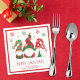 Bonitos guardanapos personalizados para a sua festa de Natal ou para as suas mesas de Natal, com três gnomos ao estilo escandinavo, com chapéus de neve sazonais e verdes, flocos de neve e "Feliz Natal" e o seu nome ou evento na tipografia vermelha.