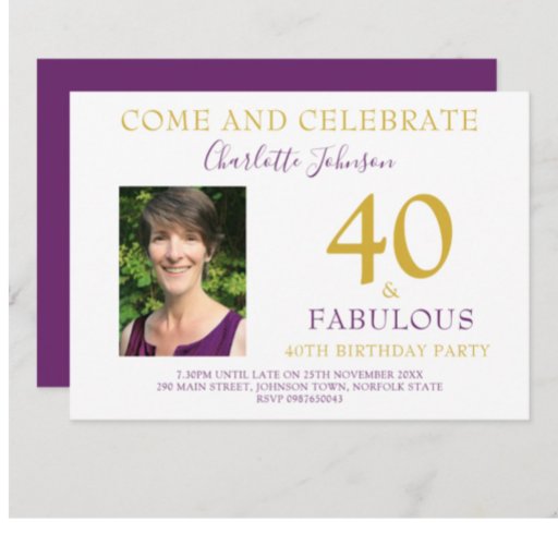 Celebrar quarenta e um marco maravilhoso com elegância e graça modernas. Escrito Dourado e roxo de 40 anos anunciando que você é realmente 40 & Fabuloso. Tema de na moda de chic minimalístico