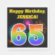 Este design de guardanapo de papel vibrante e divertido apresenta um padrão colorido inspirado em fogos de artifício celebratórios, juntamente com o número "65", tendo um padrão de gradação inspirado no arco-íris multicolor, num fundo de cor preta. Ele também apresenta um nome personalizado e uma mensagem de evento. Os guardanapos de papel como este poderiam talvez ser usados numa festa de aniversário a ser realizada para celebrar o sexagésimo quinto aniversário de alguém. [~Z0000326]