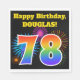 Este design de guardanapo de papel vibrante e divertido apresenta um padrão de fogos de artifício comemorativos coloridos inspirados, junto com o número "78" tendo um padrão multicolorido de inclinação, num fundo preto colorido. Ele também apresenta um nome personalizado e uma mensagem de evento. Os guardanapos de papel como este poderiam talvez ser usados numa festa a ser realizada para celebrar o setenta e oito anos de alguém. [~Z0000326]