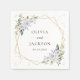 Adicione um toque pessoal à sua celebração de casamento com estes itens de na moda e festa memoráveis! Design apresenta flores roxas e brancas de aquarela, verde, confete dourado e moldura dourada sobre fundo branco.