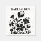 Este é um guardanapo encantador e ousado com aglomerado de flores brancas. Fundido em preto sólido contra fundo branco limpo. As flores são muito estilizadas com uma variedade de formas e tamanhos lúdicos: algumas têm pétalas simples e arredondadas, enquanto outras têm a forma de sinos. Muitos apresentam estames longos e proeminentes com pequenos pontos nas pontas, acrescentando seu caráter fantástico. A composição inclui diferentes formas florais, desde formas típicas de margarida clássicas até uma flor única, pontilhada, parecida com vagem, à direita. As flores e seus caules simples e folhas de primavera de um pedaço de terra solteiro, criando a sensação de um pequeno jardim encantado. O efeito geral é moderno, limpo e alegremente criativo.