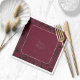 Os guardanapos de casamento elegantes em um estilo mais formal, com um layout clássico de quadros de ouro e texto com uma borda de ornamentado paisley, em forma de burgundy. Adicione seus nomes nesta bela fonte de script e data de casamento em um serifa clássico com seu apelo tradicional. Procure ID767 para ver outras opções de cores para este design.