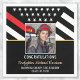Este design apresenta uma bandeira de bombeiros com listras pretas e brancas, e uma fina faixa vermelha também. Os detalhes do bombeiro graduado ficam abaixo de uma foto do novo formando da academia de bombeiros.