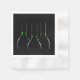 Uma silhueta de três garrafas de vinho preto com rótulos verdes que brilham no escuro.