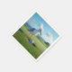 Uma gaivota coloca uma bola de golfe no buraco, colocada contra um pano de fundo cênico de um campo de golfe pelo mar