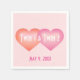 Este guardanapo de corações gêmeos - perfeito para um chá de fraldas de meninas gêmeas, batismo, ou aniversário - apresenta um coração de salmão e um coração cor-de-rosa, cada um com um centro lavado branco, sobreposto por um modelo de texto para nomes de bebês. A dupla imagem cardíaca também é apropriada para festas de noivado, casamentos, chás de panela e comemorações de aniversário.