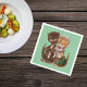 Este guardanapo de papel tem dois gatos felizes e fofos, um macho e uma fêmea, compartilhando ratos da cesta verde da fêmea amarela em um fundo verde menta escuro.