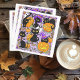Gatos pretos bonitos entre abóboras, doces de halloween, morcegos, vassoura, estrelas, milho doce, bolota, lua de cheio, folhas de outono e um fantasma cortado todos colocados num pano de fundo roxo leve