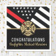 Este design apresenta uma bandeira de bombeiros com listras pretas e brancas, e uma fina faixa vermelha também. "Parabéns" e o crachá de bombeiro ficam acima do nome do bombeiro graduador. Esta design também funciona como excelente para se aposentarem bombeiros, tenentes ou chefes. Celebre em estilo!