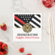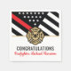 Este design apresenta uma bandeira de bombeiros com listras pretas e brancas, e uma fina faixa vermelha também. "Parabéns" e o crachá de bombeiro ficam acima do nome do bombeiro graduador. Esta design também funciona como excelente para se aposentarem bombeiros, tenentes ou chefes. Celebre em estilo!