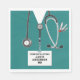 Design com tema médico, com esfregões de hospital, um estetoscópio e um canivete suíço. Editar texto para adicionar o nome do médico.