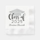 Os guardanapos personalizados de graduação de papel apresentam um design personalizado moderno e elegante com o nome do formando, seu ano de classe em um roteiro de caligrafia negra e uma boné de formando colorida de cinza prateada.