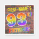 A frente desta divertida, atraente e excitante design de guardanapo de papel, tema de aniversário, apresenta um nome personalizado, e a mensagem "93RD BIRTHDAY!" com letras que têm um espectro multicolorido de arco-íris inspirado em um padrão de gradiente inspirado na parede de tijolos. A aparência é inspirada pela arte de rua ou pelo grafite desenhado em uma parede. Alguns guardanapos de papel divertidos como este podem ser usados em uma festa de aniversário sendo realizada para homenagear alguém que está comemorando seu 93º aniversário. [~Z0000367]