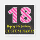 Este divertido design de guardanapo de papel, tema de aniversário, apresenta um grande número de "18" com um padrão cor-de-rosa escuro e listras de rosa claro, juntamente com a mensagem "Feliz 18º aniversário", e um nome personalizado. O fundo é preto colorido. Alguns guardanapos de papel personalizados e divertidos como este podem ser usados em uma festa para celebrar o aniversário de 18 anos de alguém. [~Z0000380]