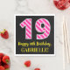 Este divertido design de guardanapo de papel, tema de aniversário, apresenta um grande número de "19" com um padrão de rosas claro e listras cor-de-rosa escuras, juntamente com a mensagem "Feliz 19º aniversário", e um nome personalizado. O fundo é preto colorido. Os guardanapos de papel divertidos e personalizáveis como este podem ser usados numa celebração de aniversário que está sendo realizada em homenagem ao 19º aniversário de alguém. [~Z0000380]