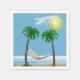 par de palmeiras tropicais na areia da praia com vista para o oceano e hammock ao sol