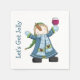 Os guardanapos de coquetel divertidos feitos em branco, com gráficos de desenho animado de boneco de neve colorido segurando um copo de vinho. Leituras de texto azuis, Vamos Obter Jolly. Confrontar convites de festas de férias disponíveis.