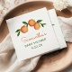 Três laranjas aquáticas em um galho folheado aparecem acima do nome da futura mãe em um guião laranja moderno nesses guardanapos de chá de fraldas com o tema dos citros. Adicione as palavras "chá de fraldas" e a data abaixo na fonte verde sans serif.