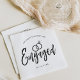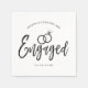 Um guardanapo com letra de roteiro divertido e único, feito sob medida especificamente para a sua festa de noivado. Ele apresenta a palavra noivado com alianças de casamento repousando sobre ele. Abaixo e acima disso estão os nomes da noiva e do noivo e a data do noivado.