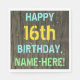 Este design de guardanapo de festa de aniversário divertido apresenta uma mensagem como "FELIZ 16º ANIVERSÁRIO, NOME AQUI!", onde o nome pode ser personalizado. O fundo apresenta um padrão de aparência rústico, castanho e falso em grãos de madeira. O texto da mensagem personalizada apresenta cores como azul, amarelo e verde, e tem uma aparência inspirada pela das letras pintadas e estêncilhadas. Napkins como estes poderia talvez ser usado numa festa de aniversário para alguém que comemora seu décimo sexto aniversário. [~Z0000292]
