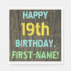 Este design de guardanapo de festa de aniversário divertido apresenta uma mensagem como "FELIZ 19º ANIVERSÁRIO, PRIMEIRO NOME!", onde o nome pode ser personalizado. O fundo apresenta um padrão de aparência rústico, castanho e falso em grãos de madeira. O texto da mensagem personalizada apresenta cores como azul, amarelo e verde, e tem uma aparência inspirada pela das letras pintadas e estêncilhadas. Napkins como estes poderia talvez ser usado numa festa de aniversário para alguém que comemora seu décimo nono aniversário. [~Z0000292]