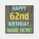 Este design de guardanapo de festa de aniversário divertido apresenta uma mensagem como "FELIZ 62º ANIVERSÁRIO, NOME AQUI!", onde o nome pode ser personalizado. O fundo apresenta um padrão de aparência rústico, castanho e falso em grãos de madeira. O texto de mensagem personalizável apresenta cores como azul, amarelo e verde, e tem uma aparência inspirada pela de letras pintadas e estêncilhadas. Napkins como estes poderia talvez ser usado numa festa de aniversário para alguém que comemora seu sessenta e segundo aniversário. [~Z0000292]