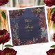 Um convite de casamento de marinho arrojado que apresenta uma sinfonia de peões vermelhos bordéus profundos adornados com spray de ouro e contornos de ouro em ximersão se reúnem em volta de um fundo de lavagem de cor azul-d-água marinho com seus nomes grandes em um roteiro rústico de ouro com uma fonte não serif maiúscula anunciando seus detalhes.