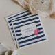 Estes guardanapos de papel apresentam um fundo azul marinho e branco de faixa, borda falsa dourada, e um bonito péony rosa em aquarelas moles. Coordena-se com nossos convites de chá de panela de Marinho Stripe & Pink Peony, suprimentos de escritório, produtos de papel e acessórios.