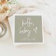 Este guardanapo chá de fraldas apresenta uma fonte manuscrita boêmica e um design minimalista moderno com uma combinação de cores verde e branca sábio e as palavras "olá, querida". Este guardanapo de papel é a adição perfeita ao seu deserto, queda ou evento de chá de fraldas boêmio neutro em questões de gênero.