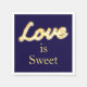 O amor é doce, escrito em luzes marqueadas sobre um fundo azul escuro dá a este guardanapo faísca e glamour. Faz uma bela adição à mesa de sobremesa. Role para baixo para ver a coleção completa do casamento. Se forem necessários itens adicionais para o seu evento, entre em contato conosco em prettyfancyinvites@gmail.com com sua solicitação.