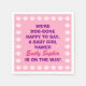 Estes guardanapos de papel exibem um fundo cor-de-rosa com impressões de pata branca e o texto "Somos felizes por dizer, uma menina chamada [nome do bebê] está a caminho! Estes guardanapos são excelente para impressão de pata temática, temática para cães, temática para cachorros ou chás de fraldas temáticos para animais.