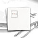 Linha quadrada fina com letras iniciais de casal no estilo de letra elegante, com a imagem de um pequeno coração rosado... colocado no canto superior esquerdo do guardanapo
