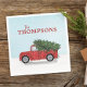 Truque Vermelho Vintage, um Caminhão Vermelho Rústico, com uma Árvore de Natal Freshly Cortada na cama do caminhão, conduzindo ao longo da estrada na neve que está caindo recentemente. Uma cena clássica de floresta de inverno que retrata uma tradição familiar familiar familiar familiar. Um design personalizado para festas de Natal e Férias de excelente e Natal e se juntem. Este design apresenta um caminhão vermelho de Natal, guardanapo de coquetel de papel para festas de férias, na moda de moda de inverno, elegante festas de férias, moderno e minimalista, moderno e mesquinho, decorador de fazendas, nome de família azul verde vermelho, estilo de tipografia moderno, cena de neve de inverno em queda, um guardanapo de cocktail de festas de Natal.