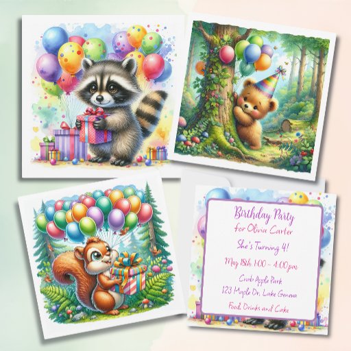 Docinho guaxinim com um presente de aniversário cercado por balões de aniversário em azul, amarelo, verde, roxo e rosa. Estes guardanapos de papel são fofos para uma festa de aniversário temida Woodland ou para qualquer criança que ame guaxinim!