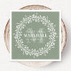 Floral Wreath Calliografia Monograma Napkin em Sage Green and White - Na moda verde e monograma branco decor de guardanapo para um casal recém-casado que apresenta um monograma personalizado, nomes de noivas e noivos, sobrenome e modelos de data de casamento cercados por uma coroa circular ousada. ©edulwhimsypaperie