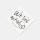 Um guardanapo com roteiro divertido e único personalizado especificamente para você em uma festa pós-nupcial. Nele estão as palavras "Nós Amarrámos o Nó" com alianças de casamento sobrepostas. Abaixo e acima disso estão os nomes da noiva e do noivo e a data do casamento.