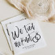Um guardanapo com roteiro divertido e único personalizado especificamente para você em uma festa pós-nupcial. Nele estão as palavras "Nós Amarrámos" com alianças de casamento sobrepostas. Abaixo e acima disso estão os nomes da noiva e do noivo e a data do casamento.