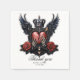 O Coração Rachado: Um Epo Gótico. Um coração gótico grande e rachado perfurado por uma seta afiada se senta majesticamente no centro da ilustração. As mãos esqueletais segurando-a parecem vir das sombras do passado, dando à imagem um apelo estranho. As duas asas pretas, que se espalham elegantemente, parecem oferecer proteção e ameaça, reforçando a aura mística da design. O fundo brilha num vermelho brilhante que se parece com o sangue de um coração pulsante, refletindo a intensidade dos sentimentos.
