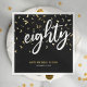 Os guardanapos modernos de festa de aniversário com fundo preto na moda, confete dourado, o título 'oitenta' numa letra branca, o ditado 'feliz aniversário', o seu nome e a data da celebração.
