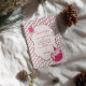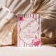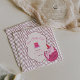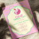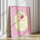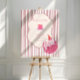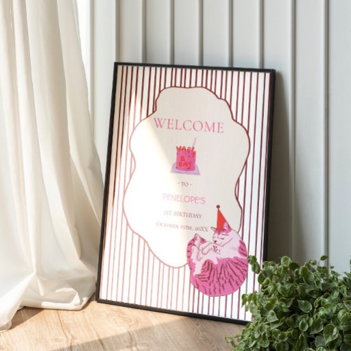 A charming pastel birthday design featuring a sleepy pink cat in a tiny party hat, framed inside a soft cream label with mint green bow details. The pink-and-yellow striped background adds a cheerful retro touch.