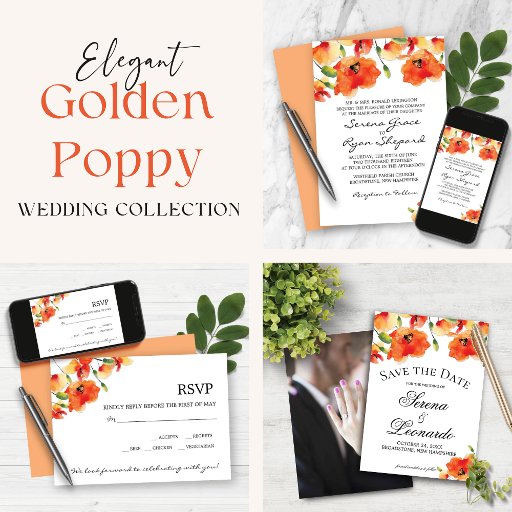 Ouro de Verão Recepção de casamento de Papanicolau Nápoles Delicadas papoilas de aquarela enquadram as bordas deste design de casamento de verão. Fácil de personalizar com suas próprias informações e detalhes. Projetado pelo Zazzle Pro Designer BK Thompson para Cedar e String; entre em contato conosco se precisar de assistência ou tiver dúvidas.