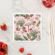 Esses elegantes guardanapos tropicais de flamingo rosa apresentam um padrão floral de flamingos cor-de-rosa desenhados à mão, flores de hibisco e jasmim, abacaxi, folhas de bananeira e bebidas tropicais, todos sobre um fundo branco elegante.
