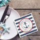 Guardanapos de papel para ocasiões especiais, casamentos ou chá de noiva com tema náutico, com listras azuis marinho, caranguejo vermelho com fonte curva.