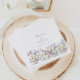 Os guardanapos de papel para casamentos de flores silvestres que apresentam gráficos bonito de flor silvestre, uma paleta de cor rosa pincelada, azul, lilás, amarelo e verde e uma fonte moderna. O na moda é perfeito para um casamento de verão com o tema da flor-de-ventre. Par com qualquer coisa na coleção ELODIE para um olhar coeso.