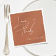 Guardanapos de papel modernos e elegantes com escrita rústica em terracota "amor + obrigado" com os nomes dos noivos para casamentos ou qualquer ocasião especial.