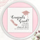 Crie guardanapos únicos de graduação dizendo Parabéns Formando, ano e modelos de nomes decorados com boné de formando e ilustrações de diploma em cores rosa. A tipografia está em preto nesta design.