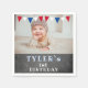 Frente de primeiro aniversario de Foto Moderna Napkin / Bonitinho guardanapo de festa de aniversário para uma festa de primeiro aniversario com uma foto personalizada. O design tem bandeiras de montagem em cores vermelha, branca e azul e um fundo do quadro. Personalize este guardanapo de festa de aniversário com a fotografia de uma criança e o nome da criança.