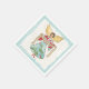 Estes guardanapos são decorados com um delicado anjo de Natal. Ela veste um vestido floral azul, vermelho e verde, e suas asas são coloridas com um padrão de ouro. Ela segura uma faixa com a mensagem "Paz na Terra" que você pode personalizar. O fundo é uma partitura desbotada com borda azul.